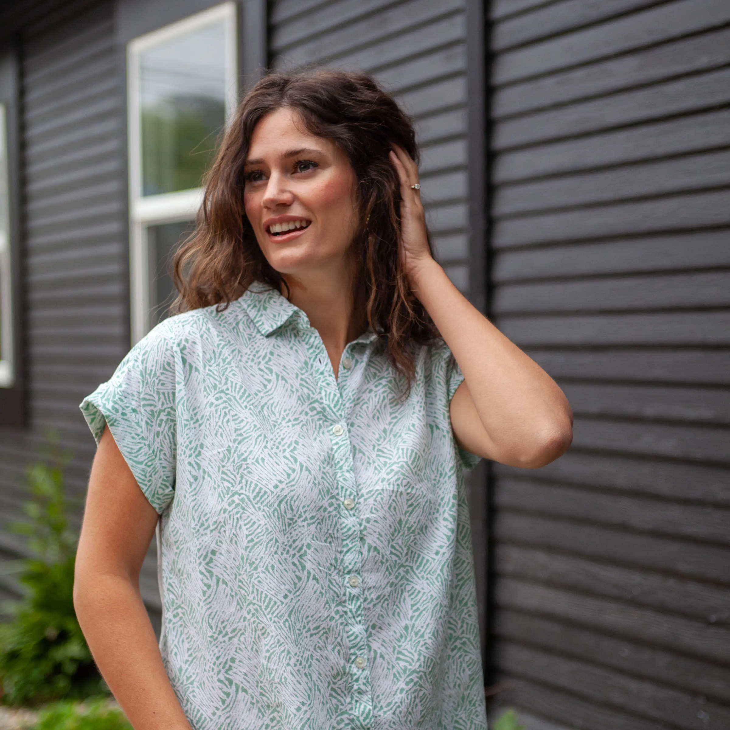 Meet the Beachcomber Patterned Button Front Short Sleeve: light, playful, and full of personality. Made from breathable organic cotton crepe, it features nature-inspired patterns in shades of sea blue, leafy green, & earthy taupe-each one with that sun-washed softness that feels like summer.