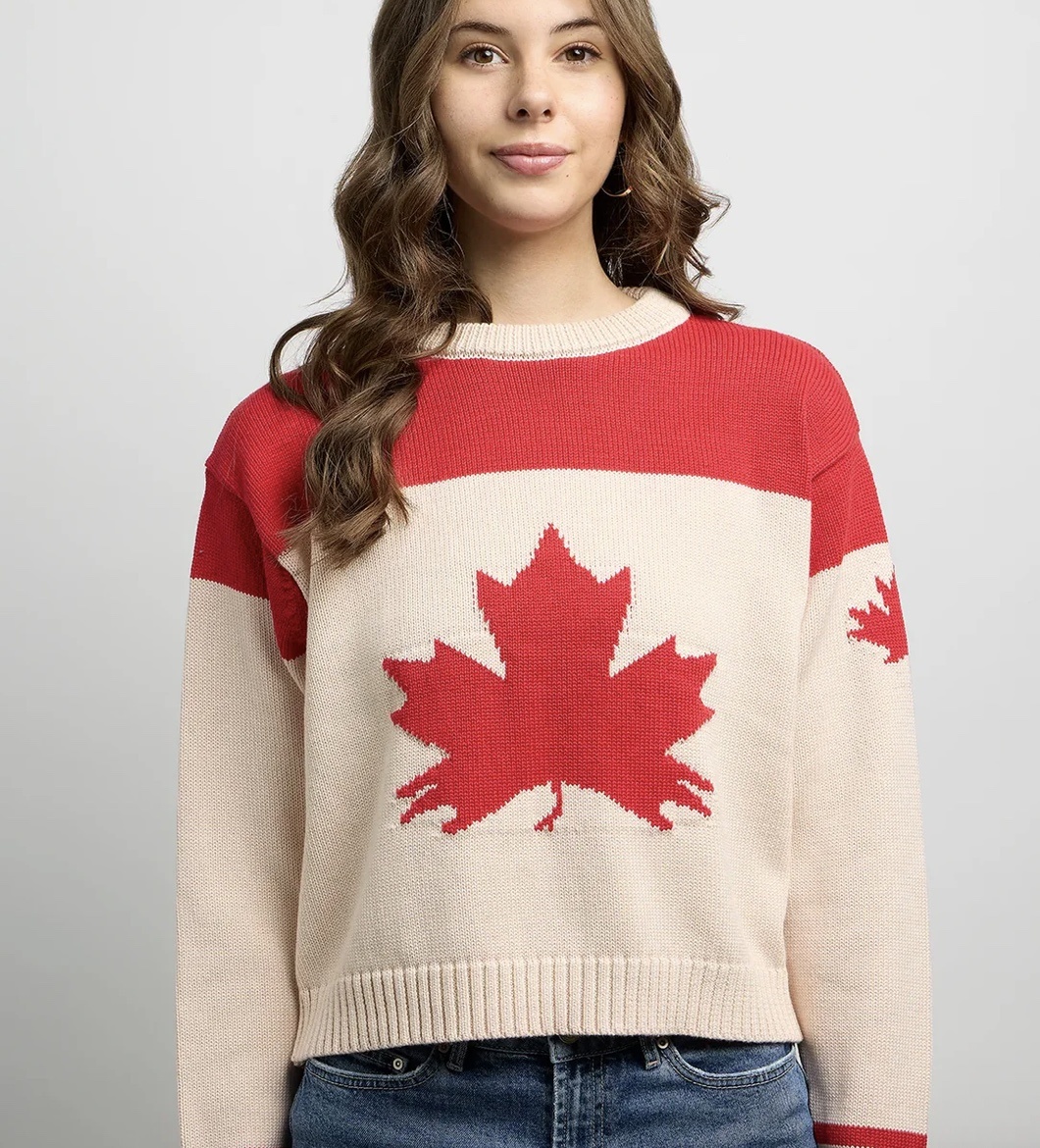 Wide-cut cropped sweater with a clean silhouette and maple leaf details. Made in Canada from 100% cotton for comfort and ease.