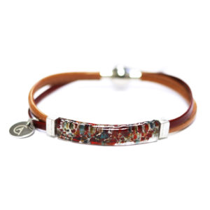 Bracelet made from two leather straps and decorated with a piece of tin and glass.