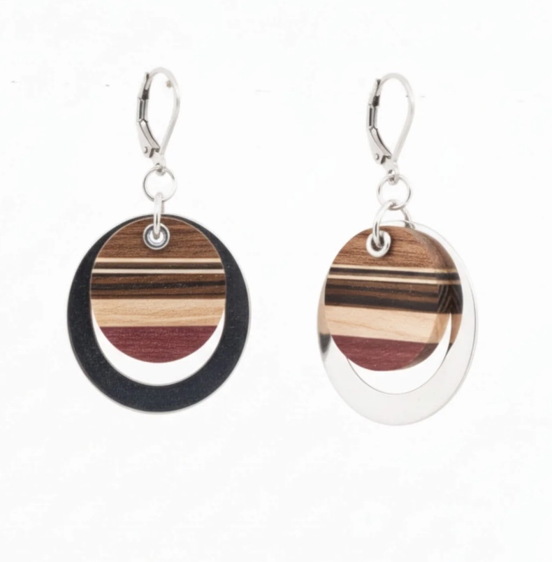 A stainless steel disc that subtly catches the light to give relief to a delicate round wooden mosaic, the Armillo earrings are light, but do not go unnoticed!