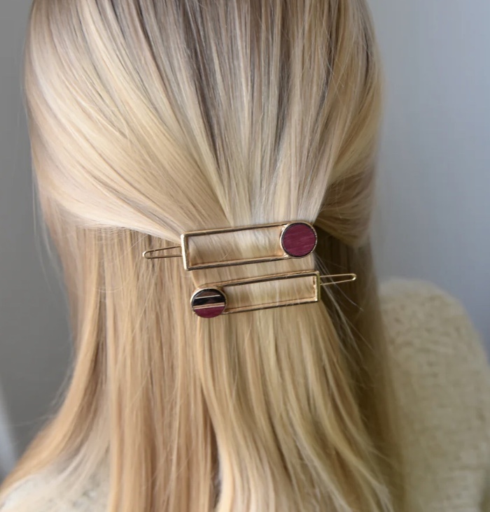 Add a touch of minimalist chic to your hairstyle with this golden wood mini hair clip. Perfect for gently tucking away a few strands, it’s ideal for fine hair or creating a quick, elegant look.