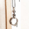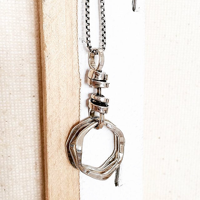 This classic necklace is forged from recycled sterling silver. The pendant is approximately 1.25″ in length. A patinated barb wraps around 3 undulating circles that are 1/2″ in diameter. The chain is a shiny rounded box chain completed with a signature tag. A beautiful compliment to any casual look!