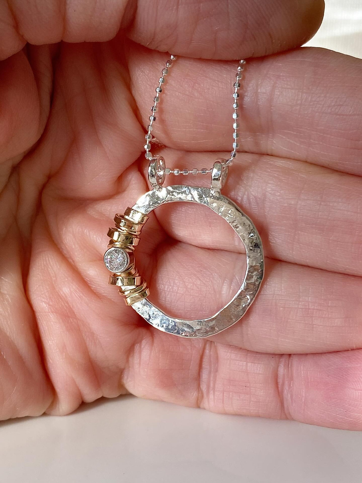 The Sparkle Circle Necklace is hand-formed and textured to beautifully reflect the light! A 4 mm bezel set CZ is wrapped with rich 14K gold-fill wire. The hand-fabricated bail rings echo the pendant’s texture, creating a cohesive, artisan finish. The pendant measures 1.125″ from top to bottom. Strung on a sterling silver Sparkle chain and finished with a sterling silver signature tag.