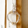 This stylish pendant is approximately 1″ in diameter, it is hand formed and enhanced with 2 cubic zirconias. Accented with 14K gold-fill or sterling silver. The flattened round cable chain connects to the pendant with 2 hand-fabricated hooks and is finished with a sterling silver signature tag.