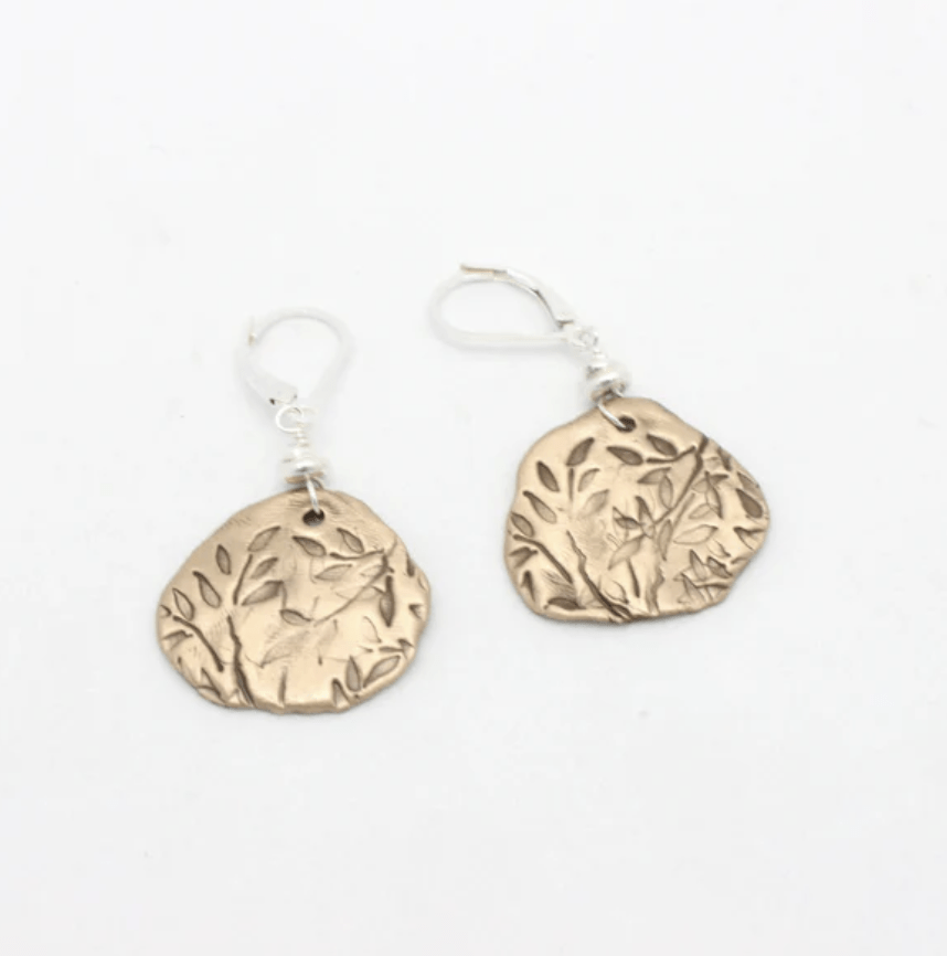 Random leaf patterning on a freeform bronze pendant. Measures approximately 2.5 cm x 2.5 cm. Finished with freeform fine silver silver nuggets.