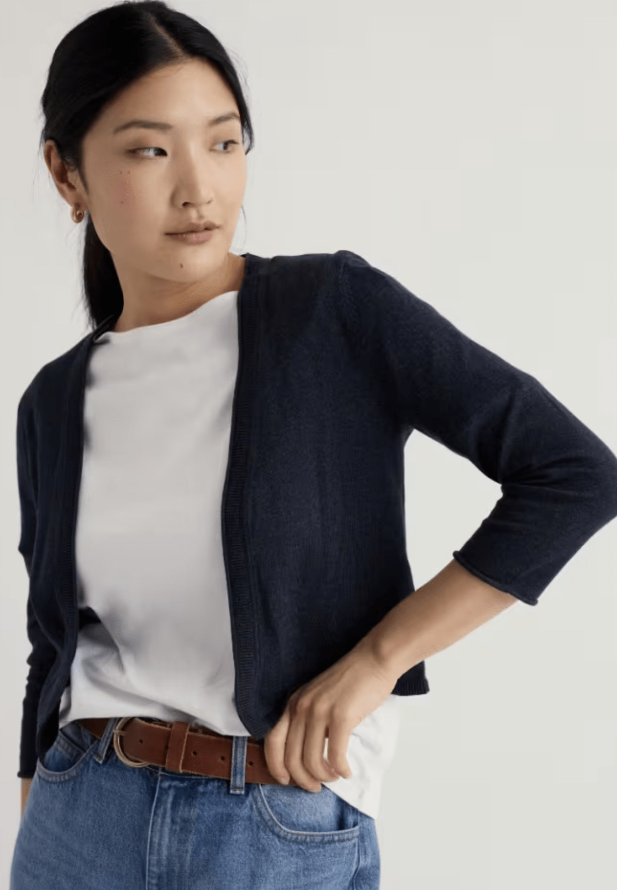 The perfect summer layer. Our Vanessa Cardigan is a lightweight, semi-fitted style that falls to the natural waist. Made from soft cotton with 3/4 length sleeves and a subtle rolled edge finish on the placket and cuffs for a feminine touch.
