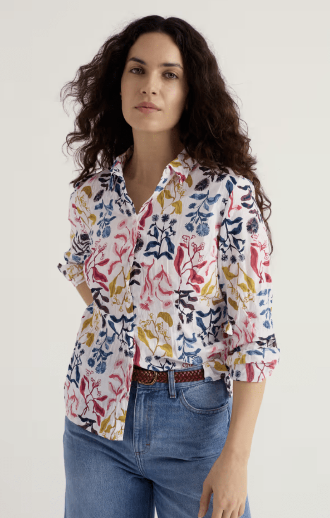 Our Larissa Shirt is a year-round favourite. Made from the softest organic cotton with a casual crinkled appearance, the beauty of this shirt is that it doesn’t need ironing – just wash and twist to keep the crinkle. This semi-fitted style is easy-to-style and comfortable, with long sleeves and button loops so you can roll up the cuffs to change your look. Each season, it showcases some of our most-loved prints, created by our talented textile designers.