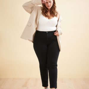 Emily, our slim silhouette, is worn close to the body and has a tapered leg. This high-rise skinny jean features a 30″” inseam and sits at the ankle. The deep black colour makes this a classic style with clean finishes and tonal stitching. A great way to incorporate denim into your work wardrobe. Made with our ultra soft touch Flow fabric, this style uses organic & recycled cottons that are lightweight while still maintaining their shape from day to night.
